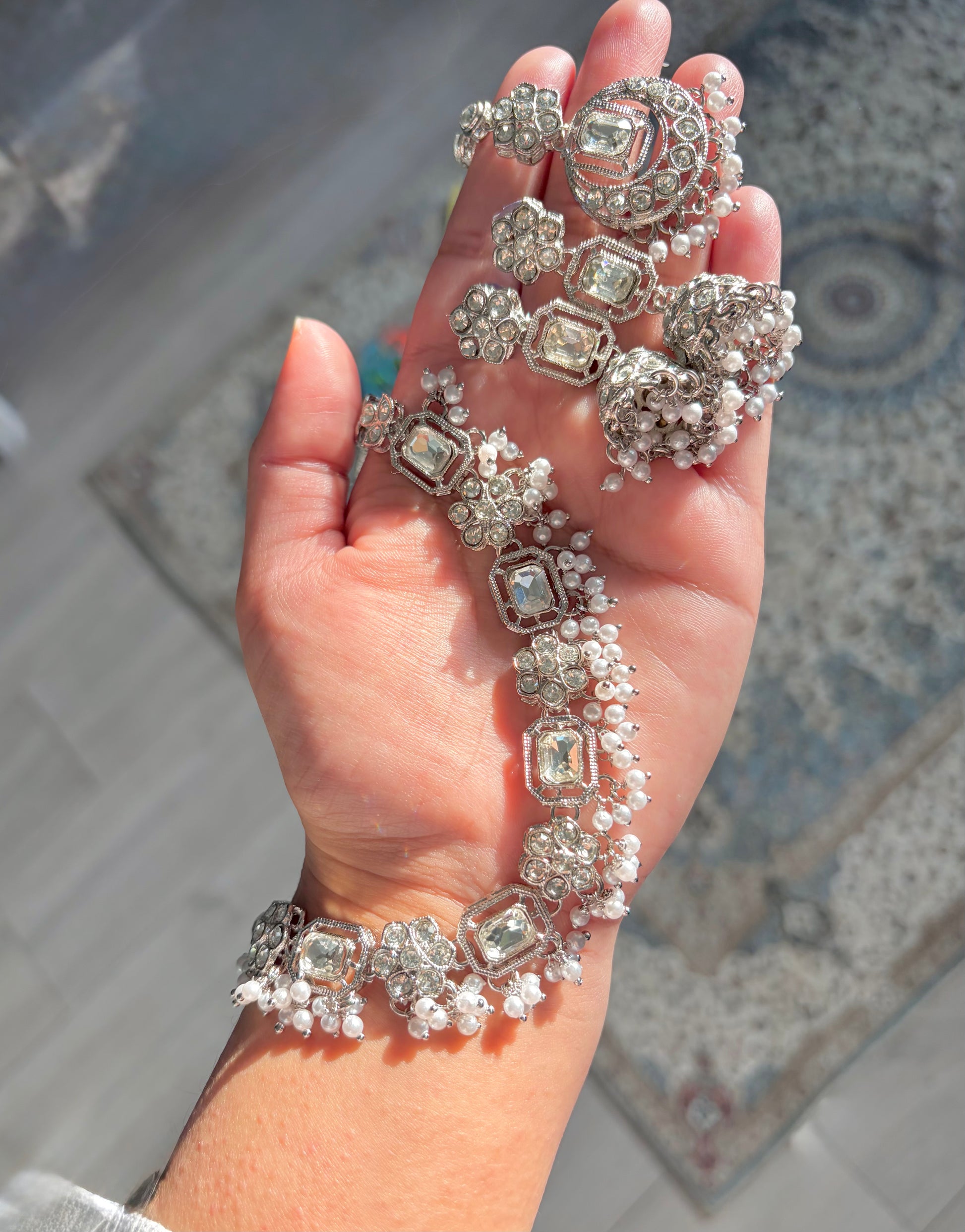 Beautiful pearl and champagne kundan choker set with matching jhumkay and a tikka!