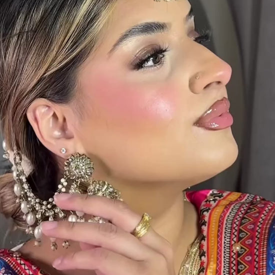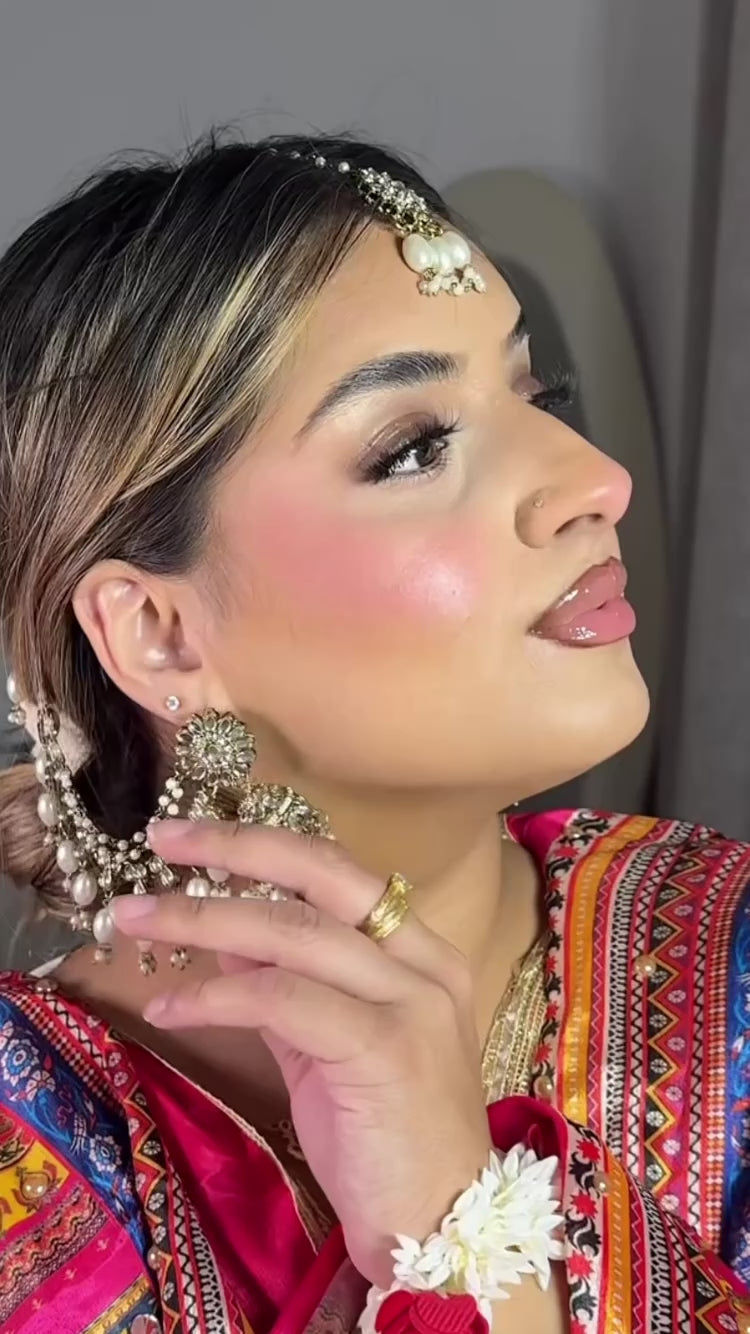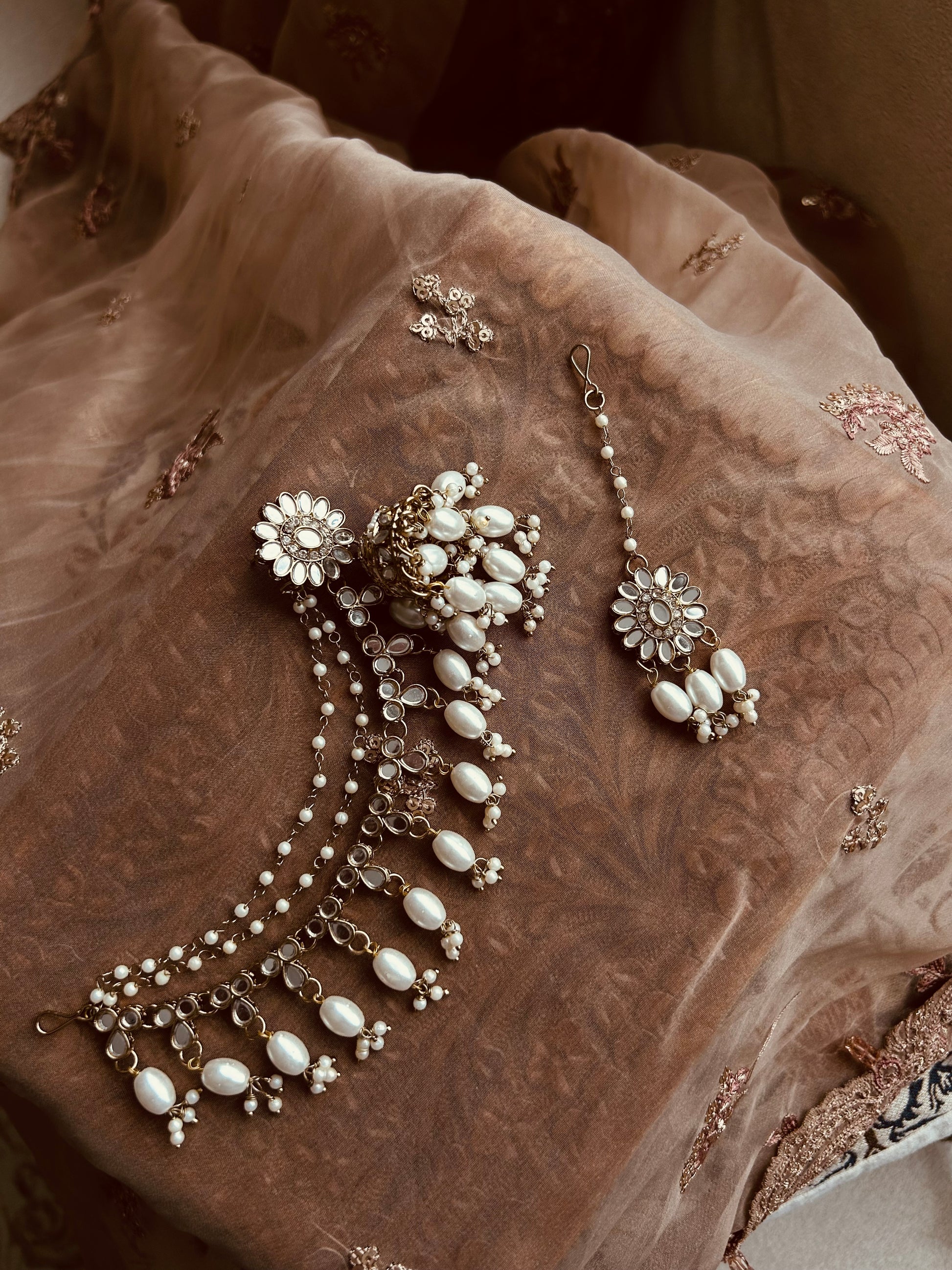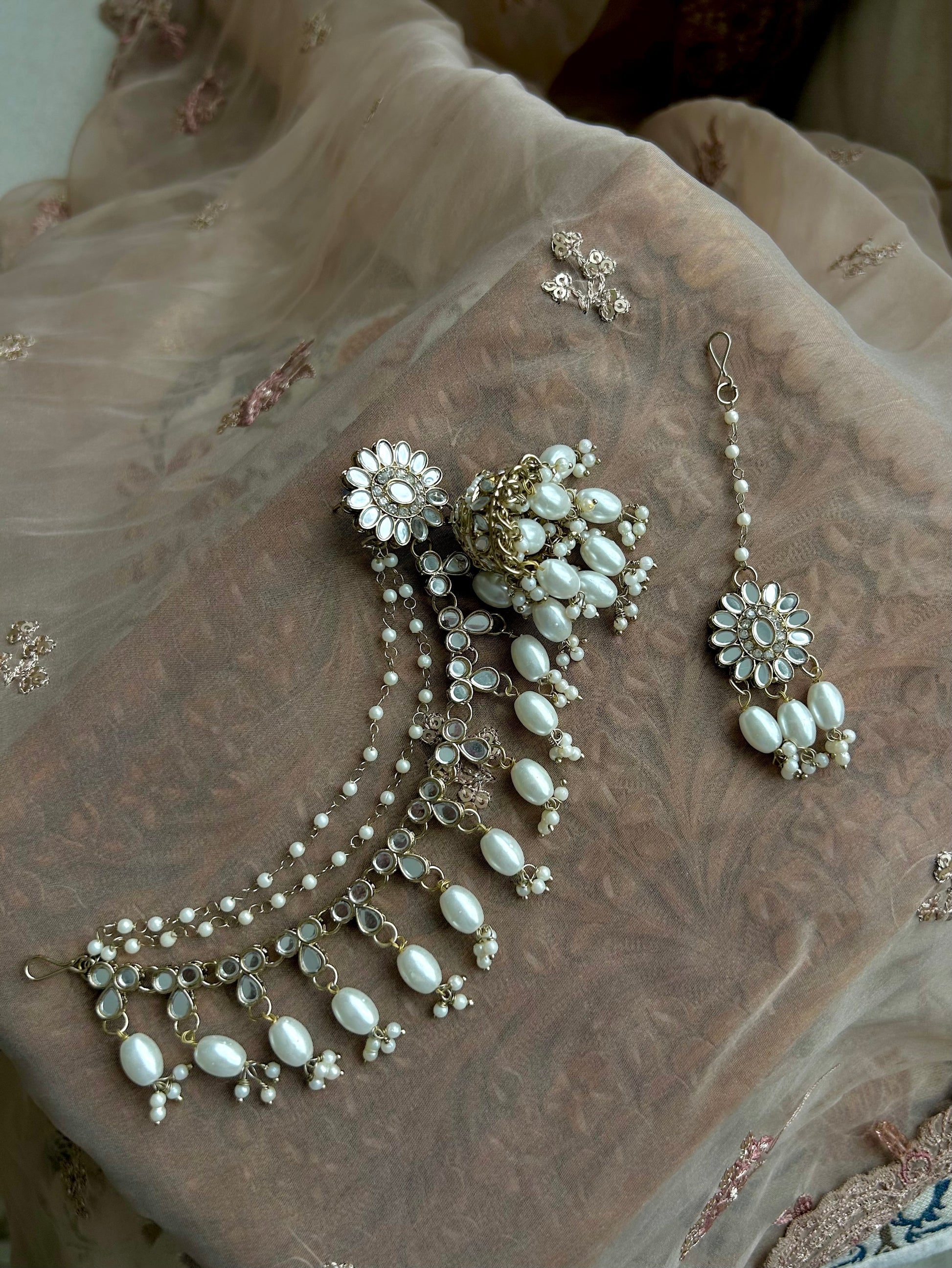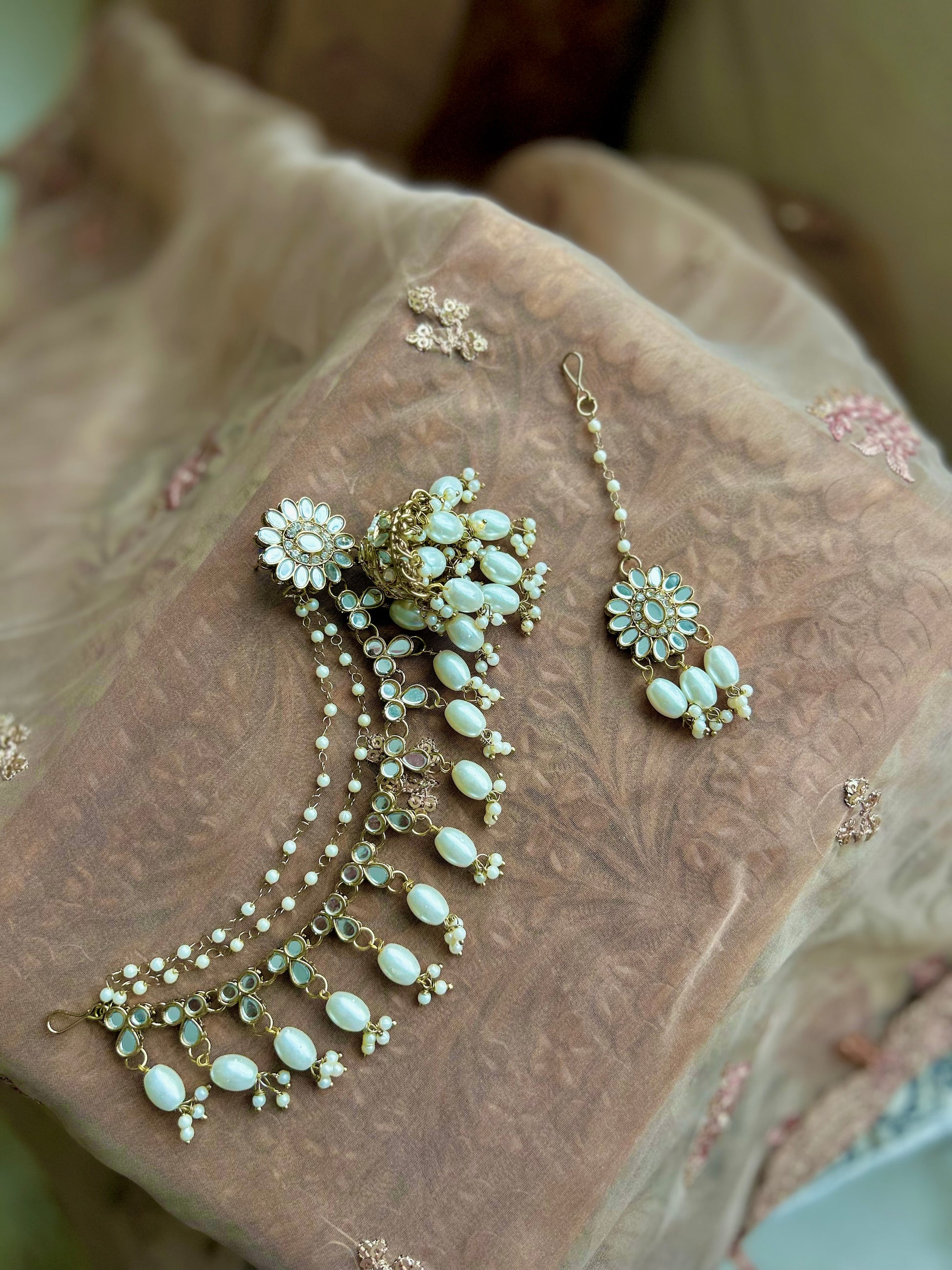 Comes with Jhumkas and tikkas. Jhumkas have attached mirrored and pearl saharey. Delicately detailed in colours shown. Saharey have THREE layers.