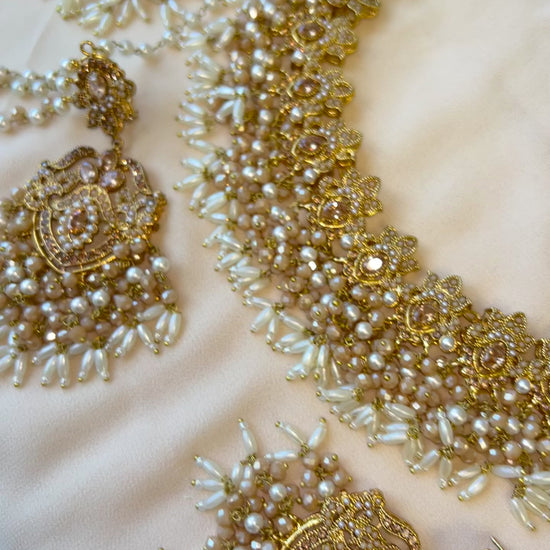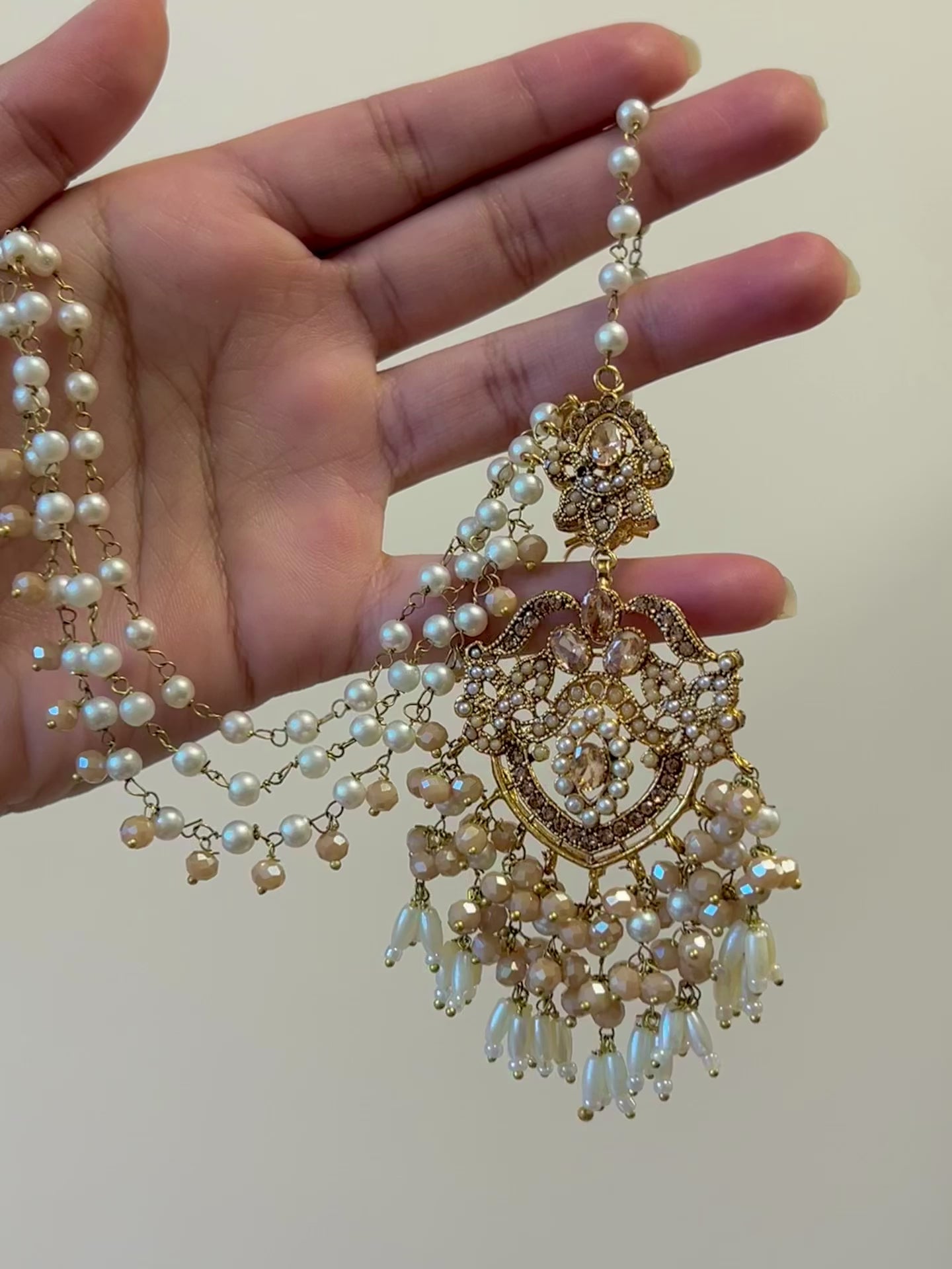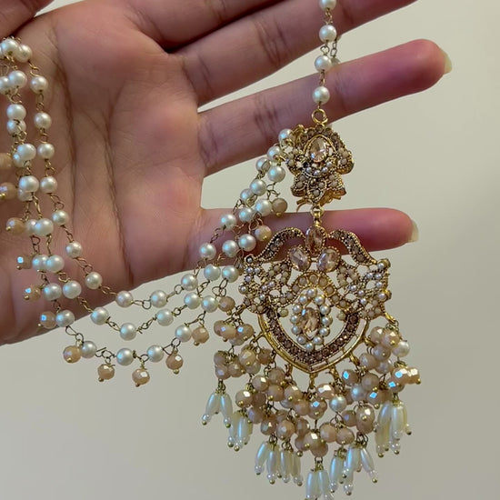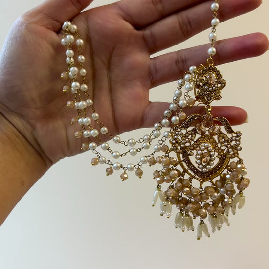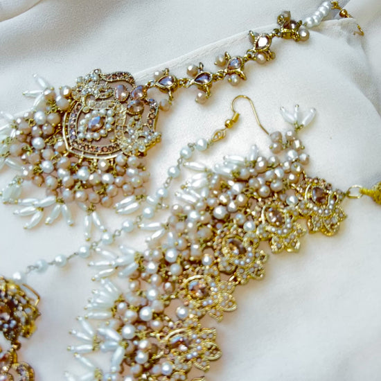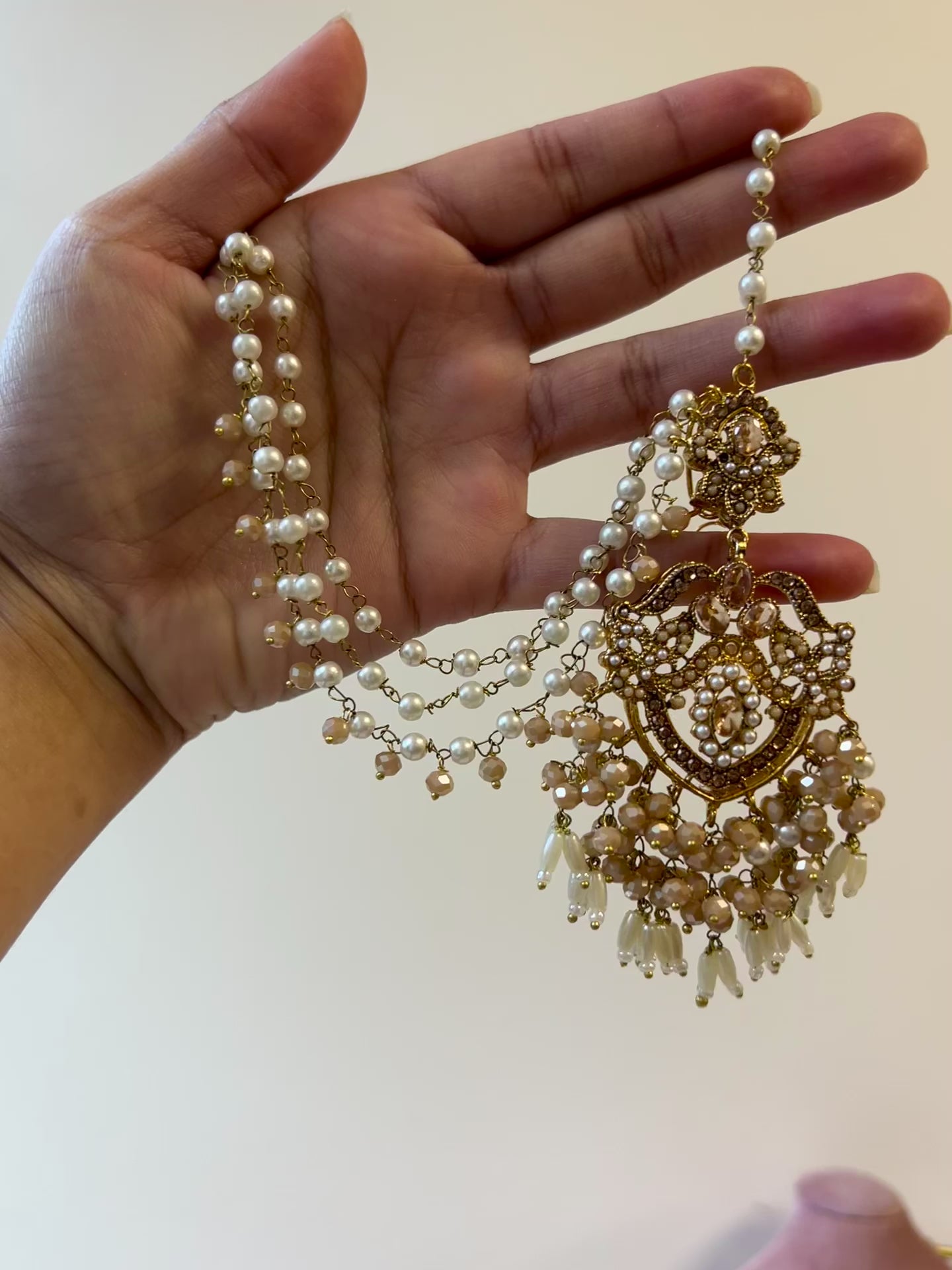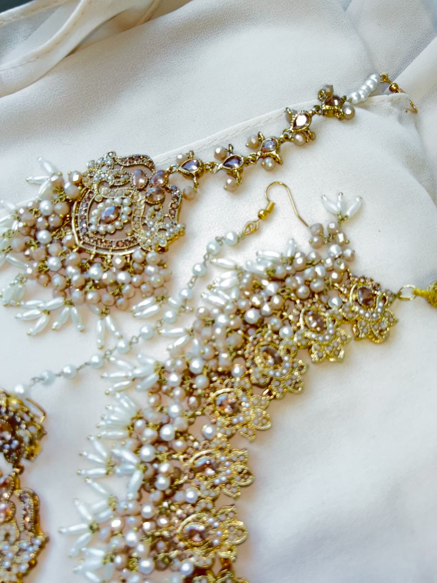 Stunning set includes lightweight gold plated earrings with three saharey chains (ear chains to attach to hair), and one sahara pair to go over the ears , as well as a stunning necklace adorned with pearls and zircon stones , and a matching tikka.