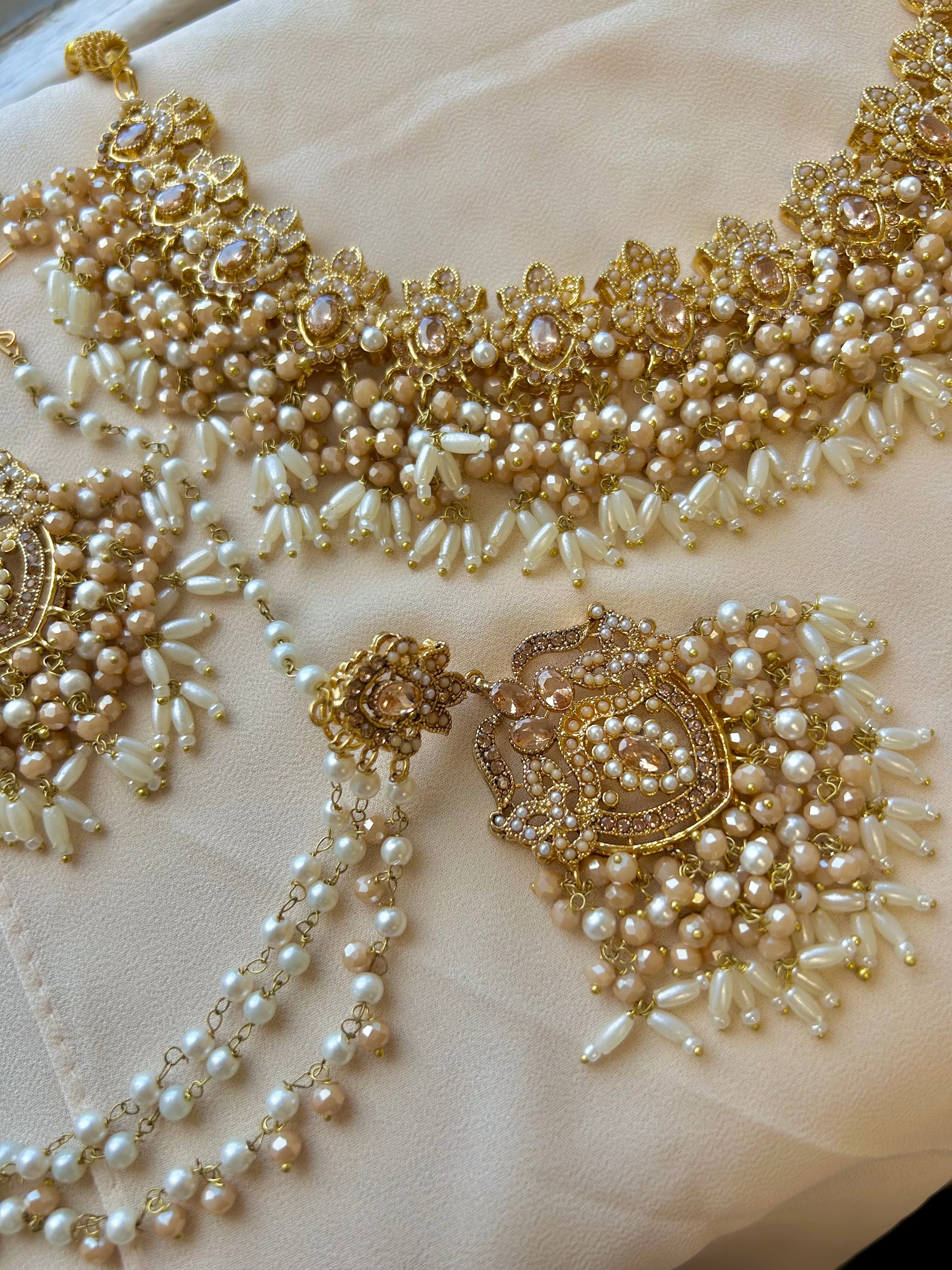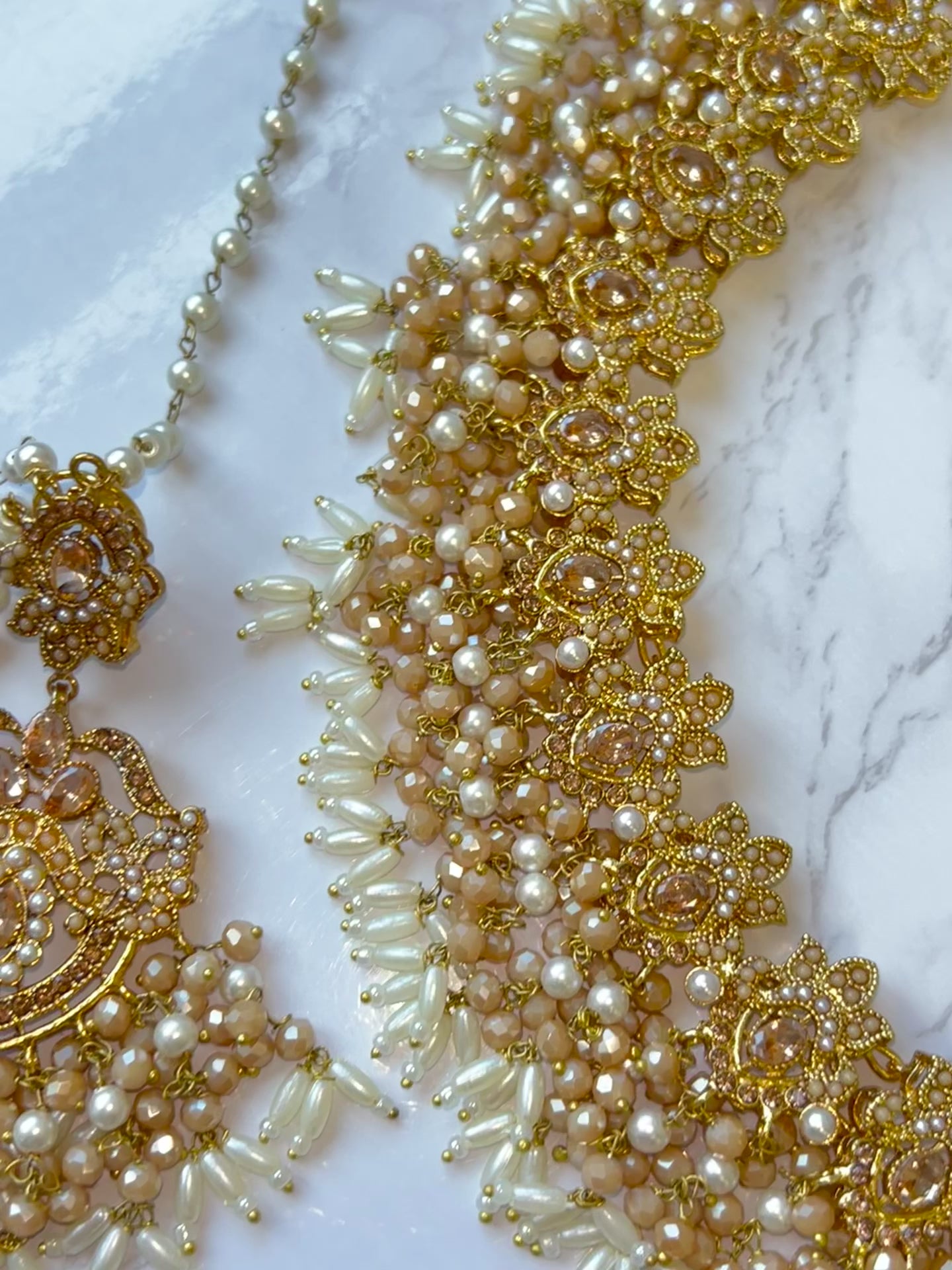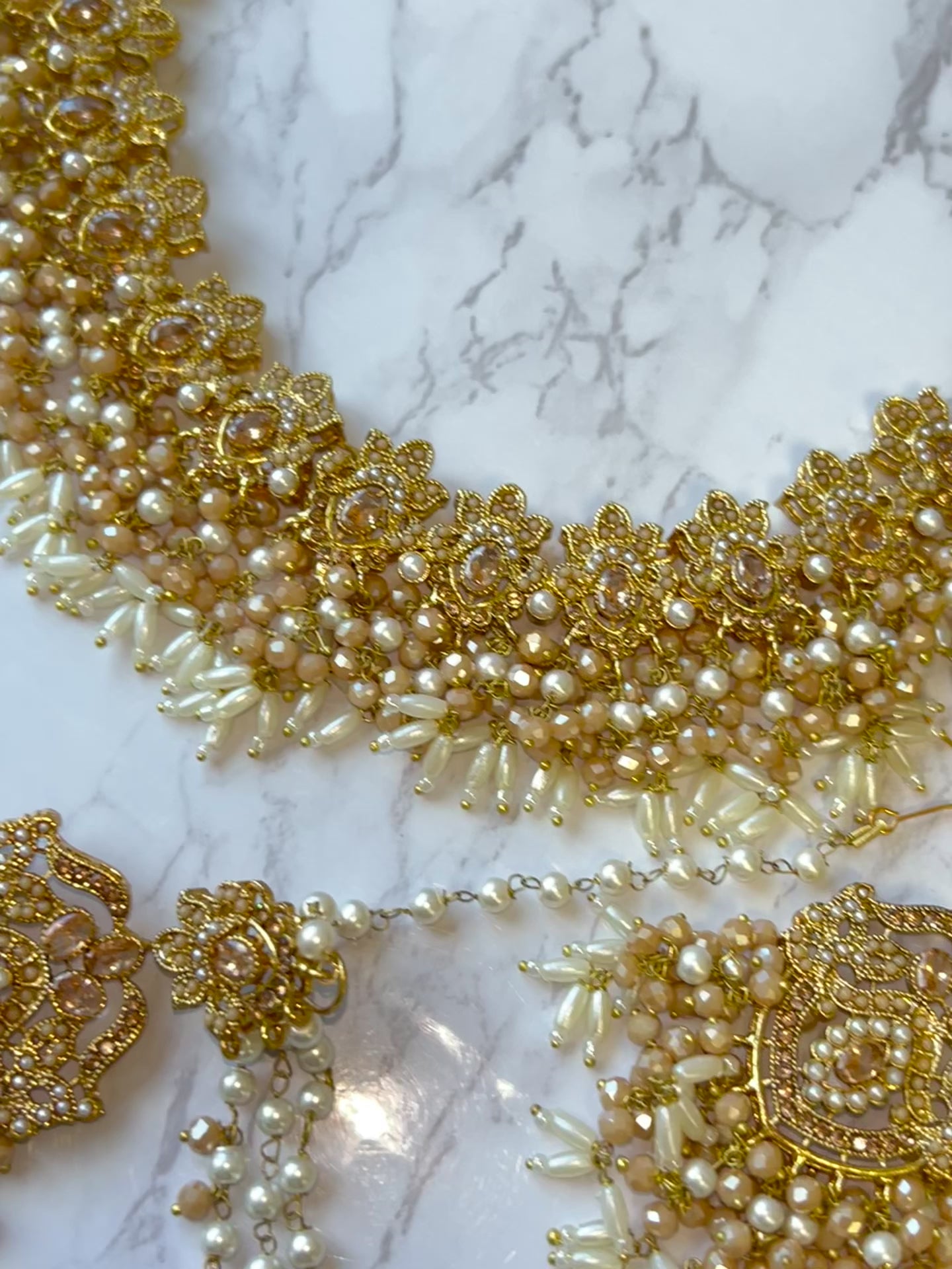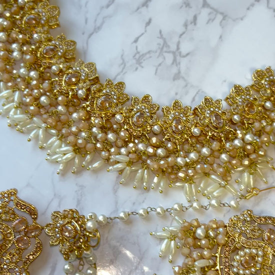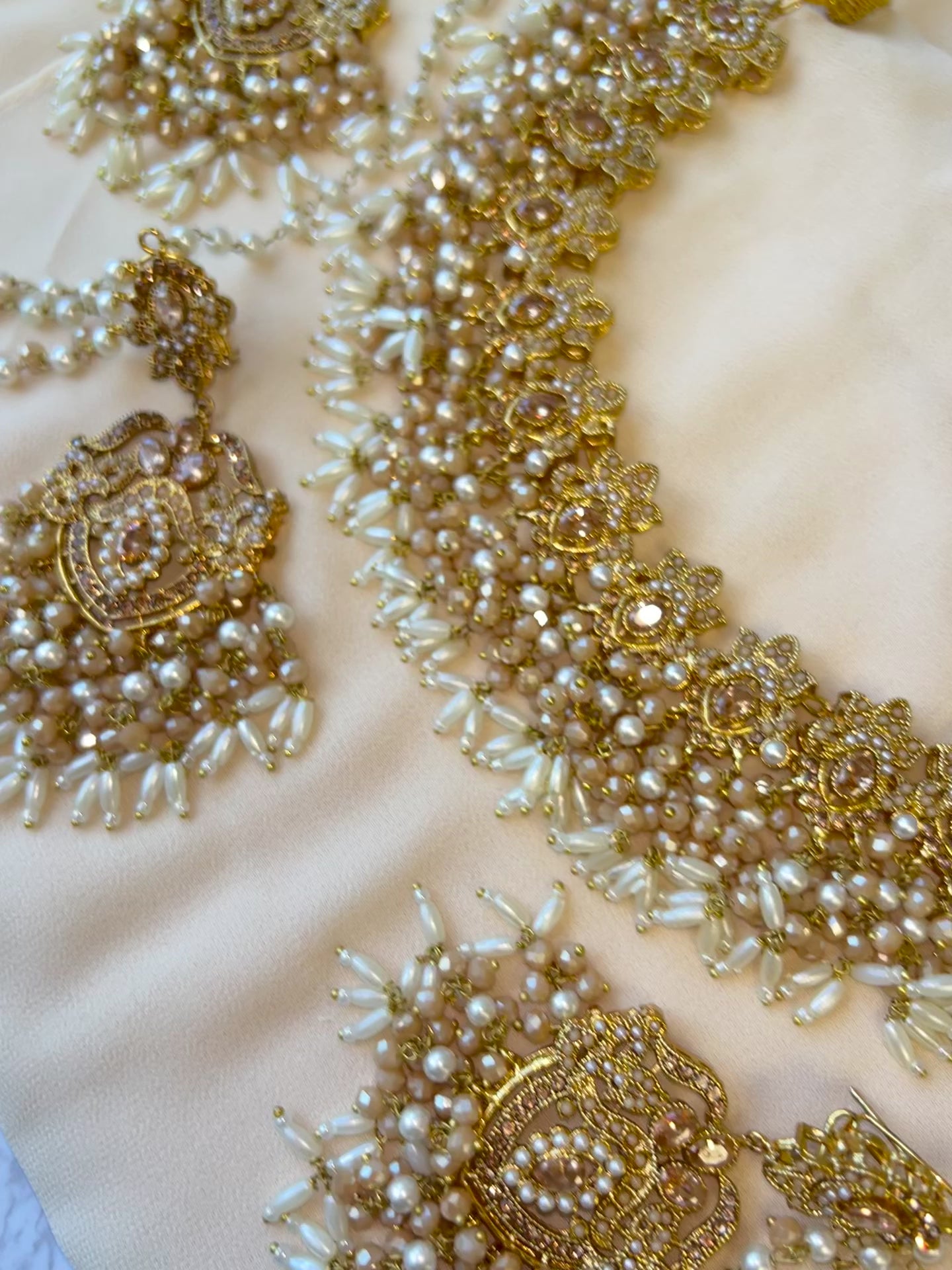 Stunning set includes lightweight gold plated earrings with three saharey chains (ear chains to attach to hair), and one sahara pair to go over the ears , as well as a stunning necklace adorned with pearls and zircon stones , and a matching tikka.