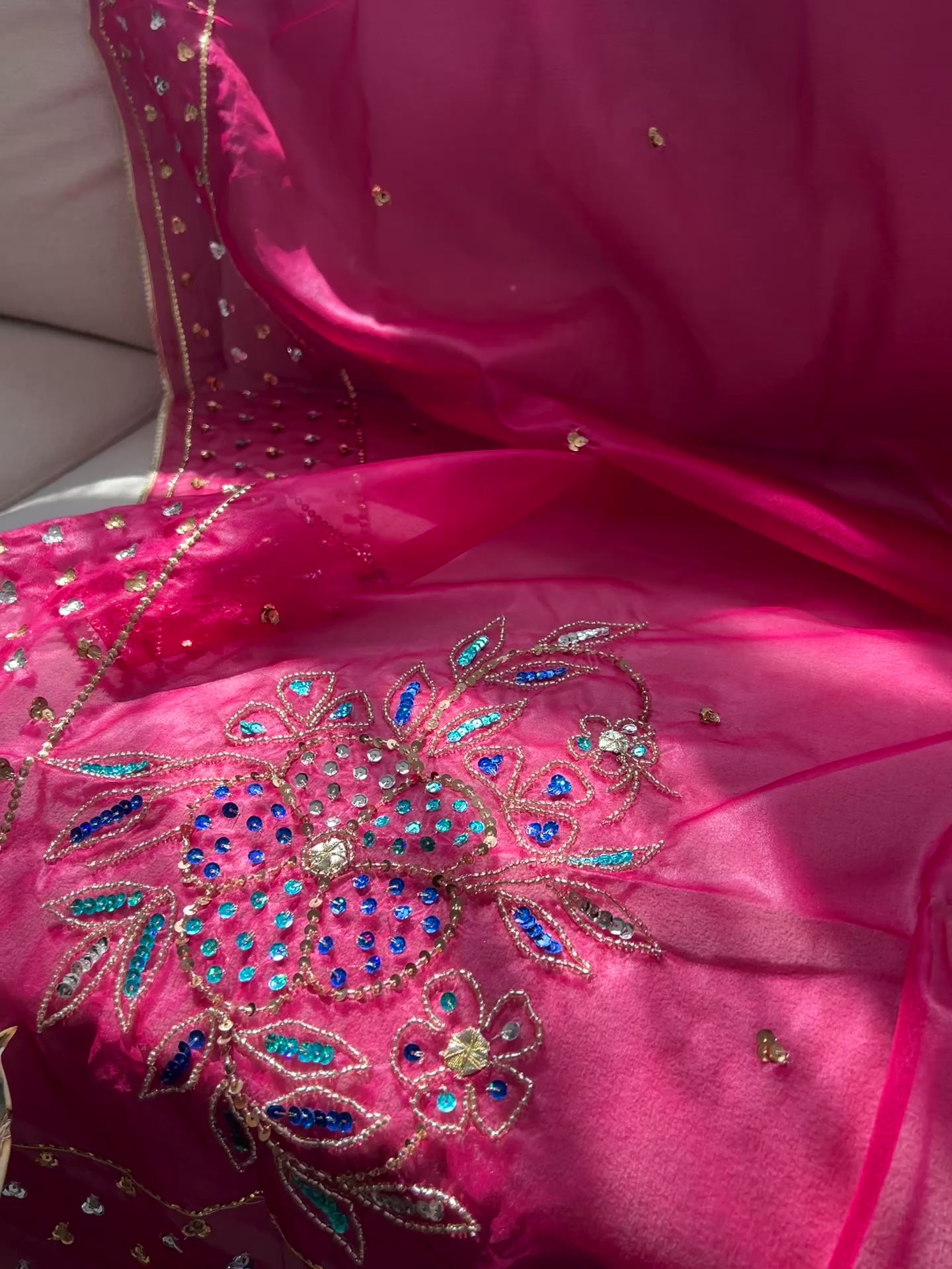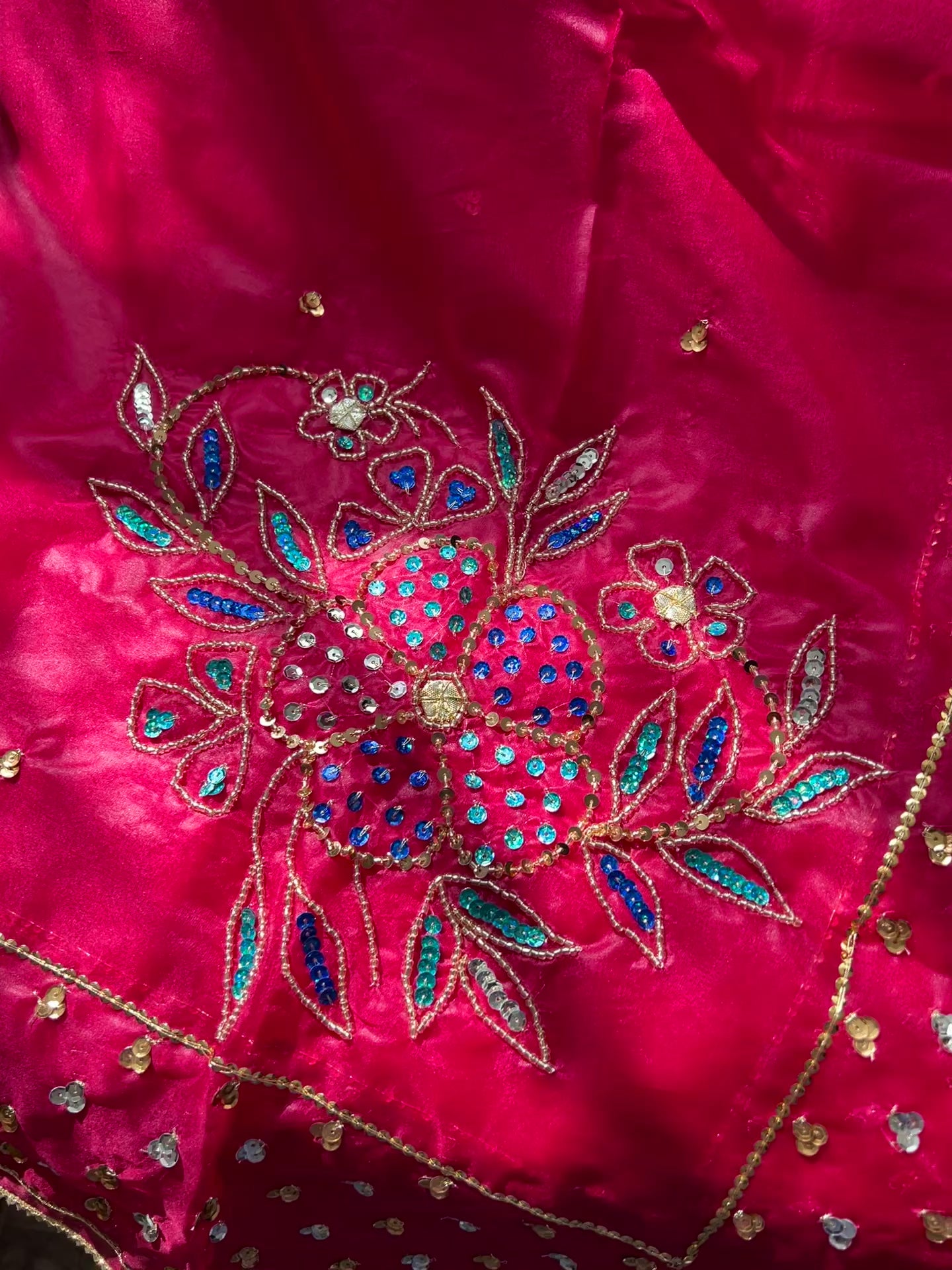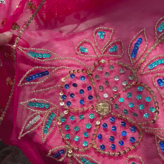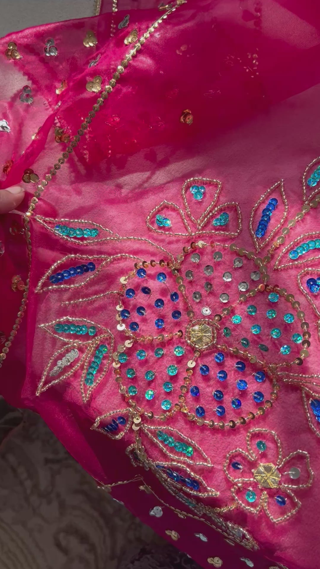 On opposing ends of the Dupattas have a stunning hand embroidered beaded flower with different coloured sequins. The colours may vary slightly due to lighting and editing etc !