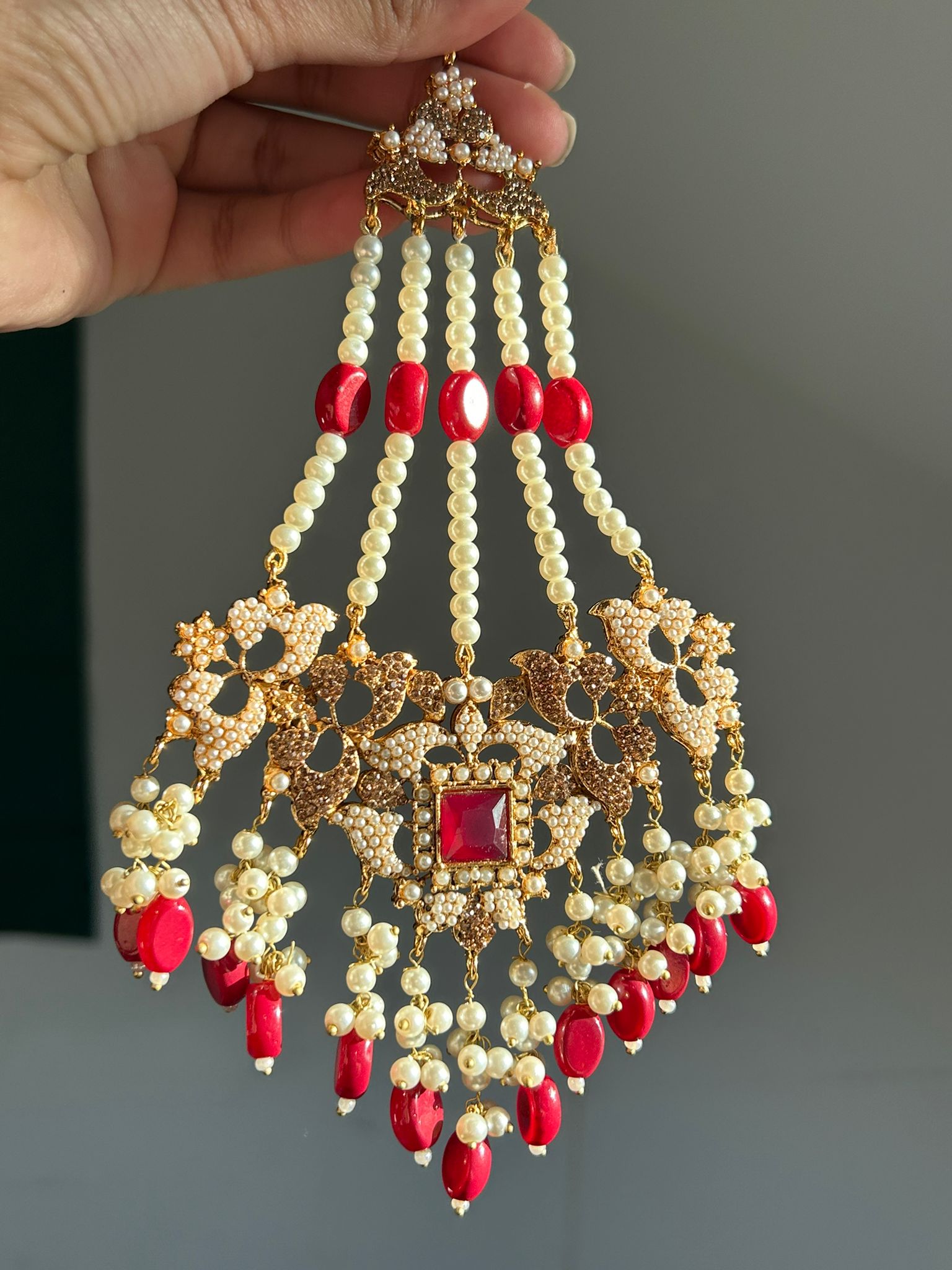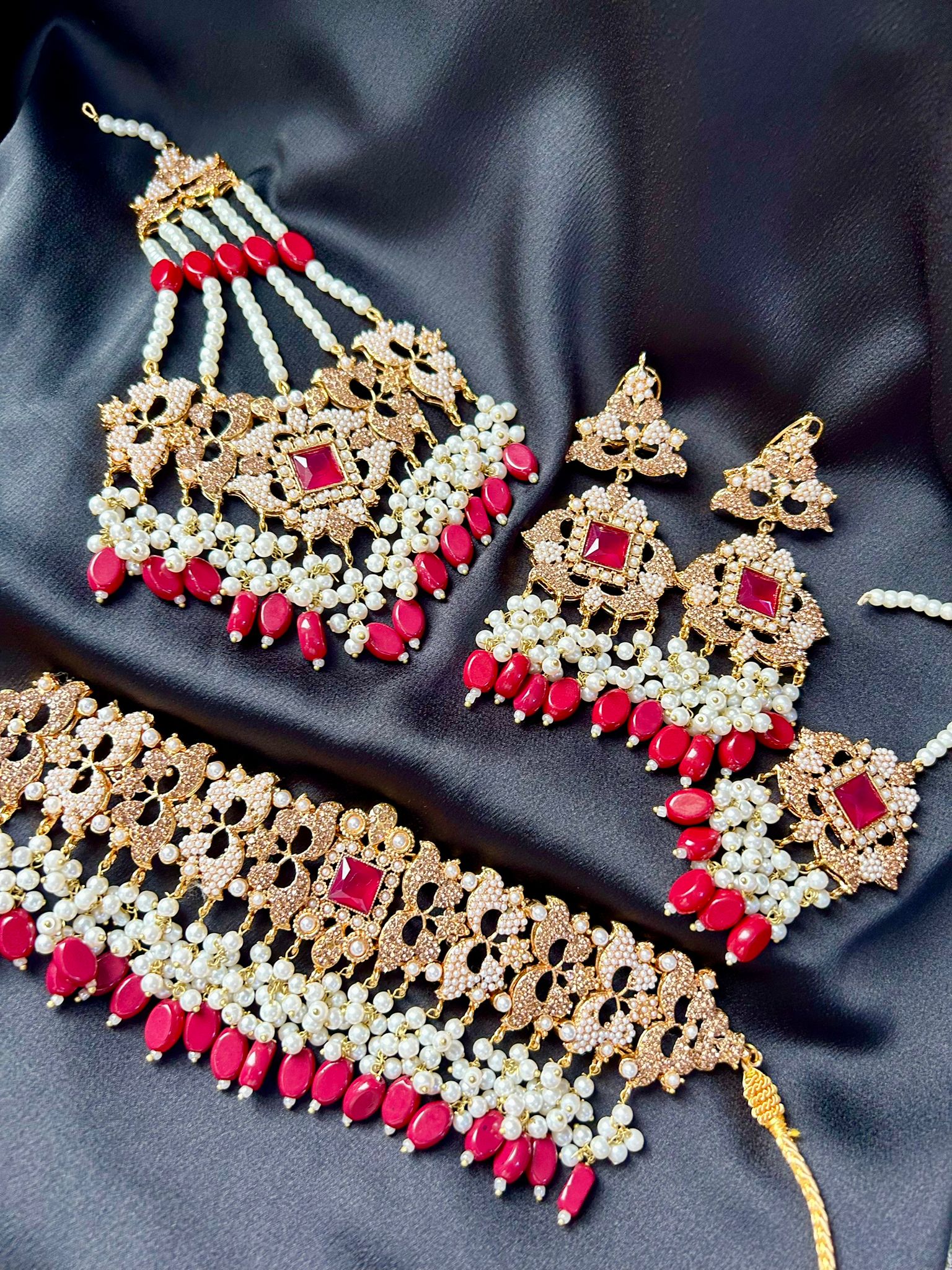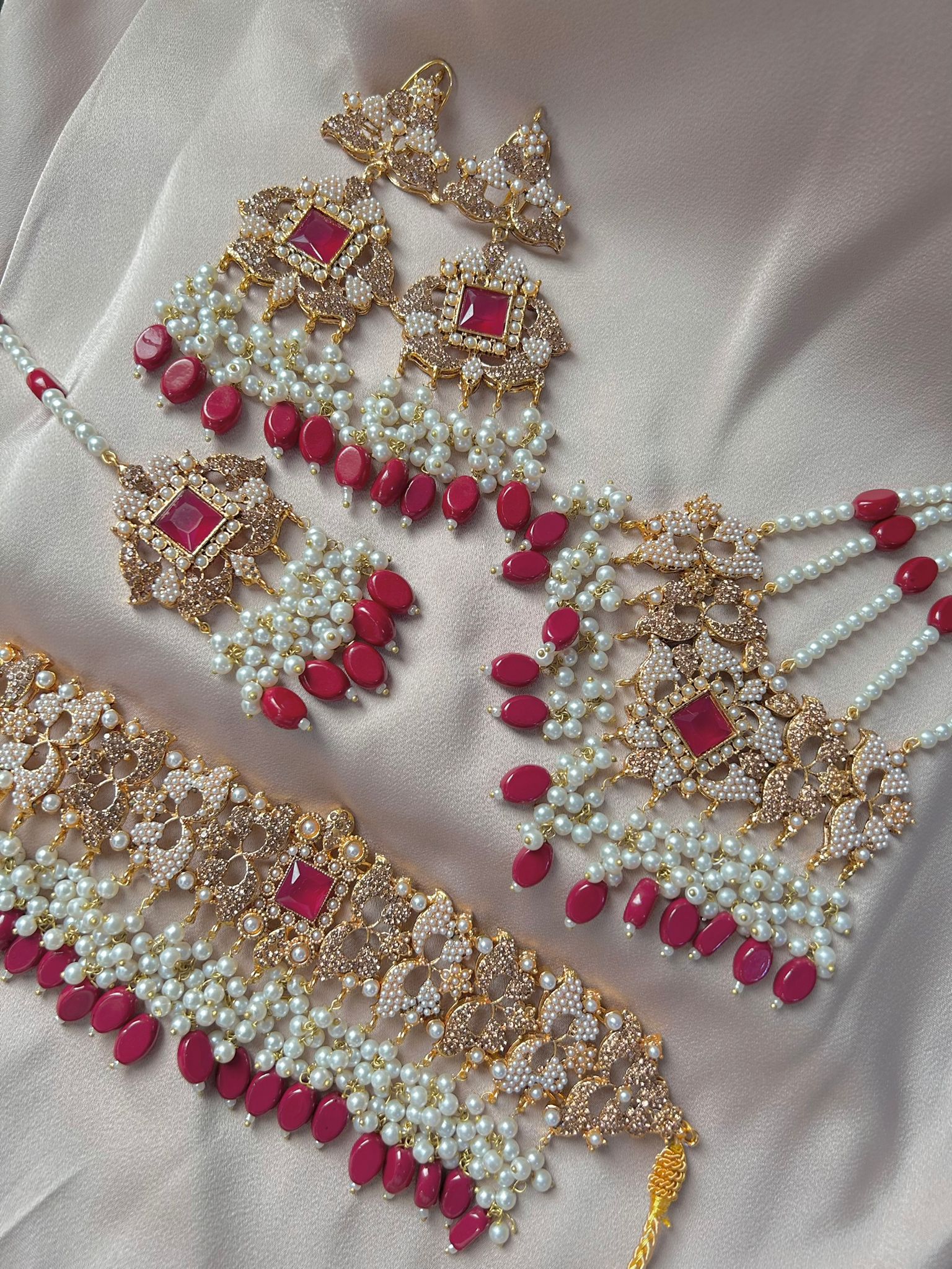 Beautiful Bridal set including a gold and faux pearl choker adorned with faux pearl beads, with matching earrings , a jhumar and a tikka!