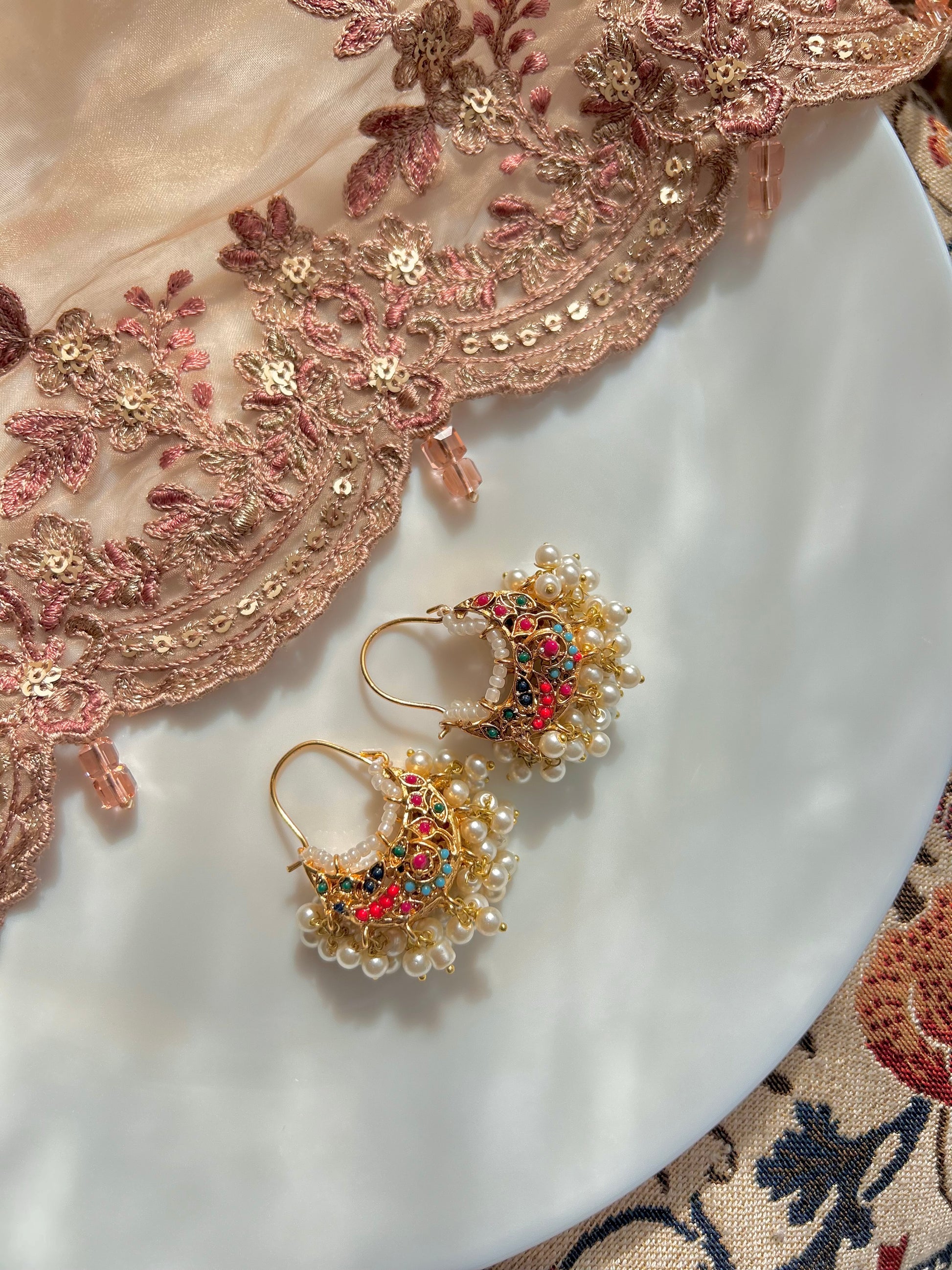 Lightweight gold plated noortan multi hooped jhumkay with faux pearl and noortan stones. Material used is Gold plated steel.