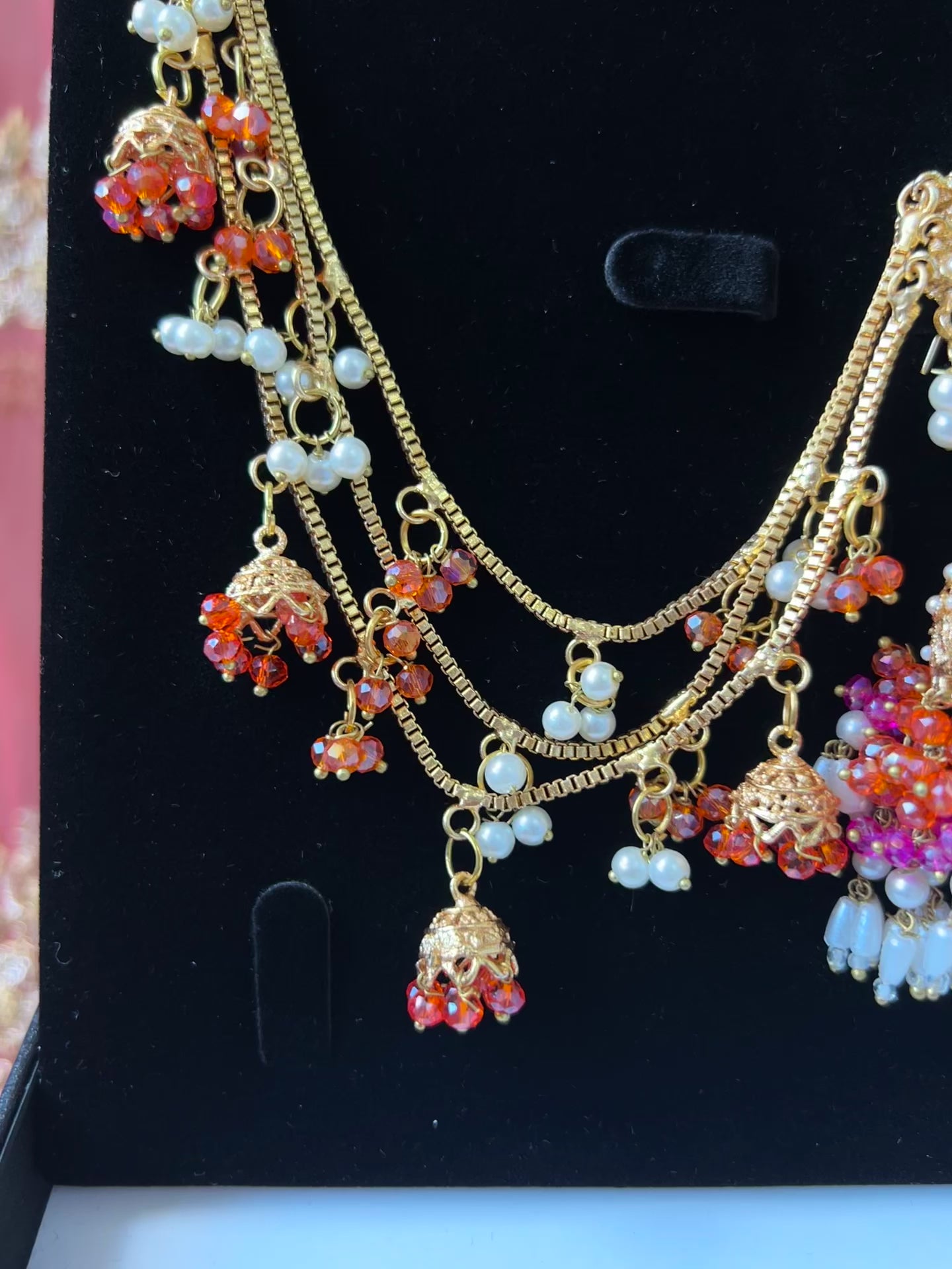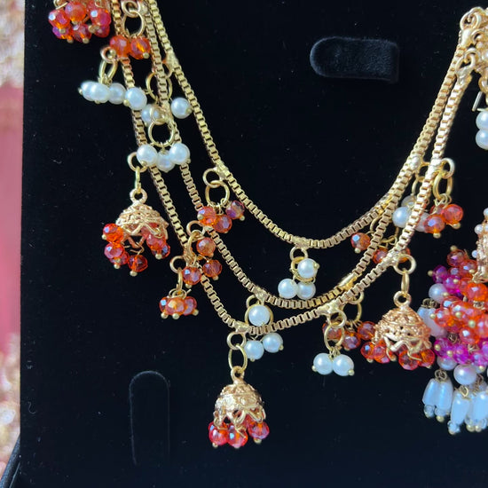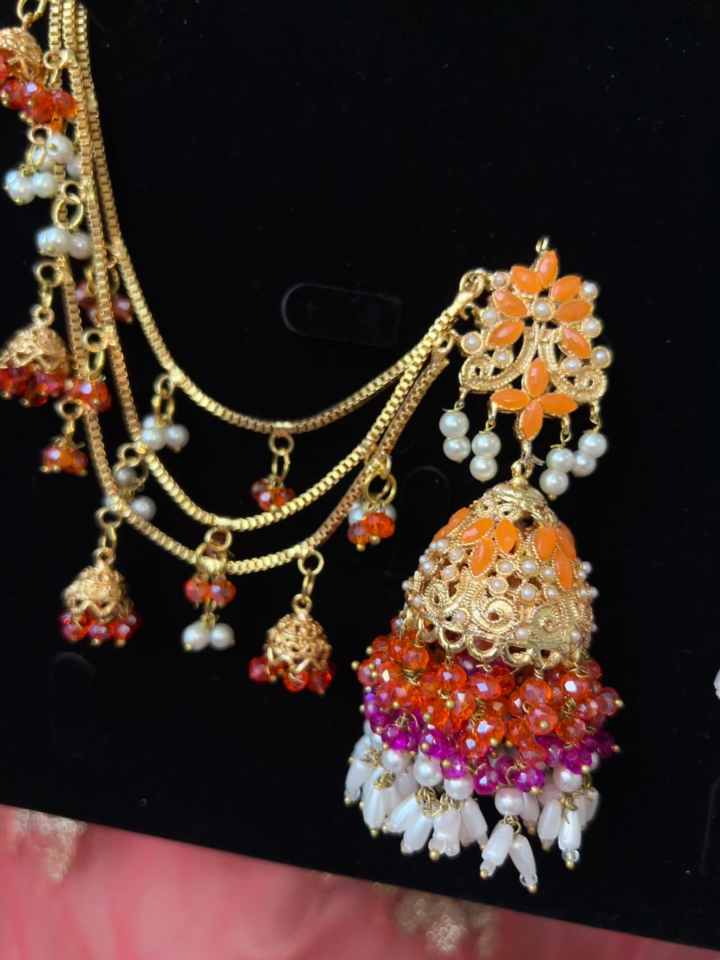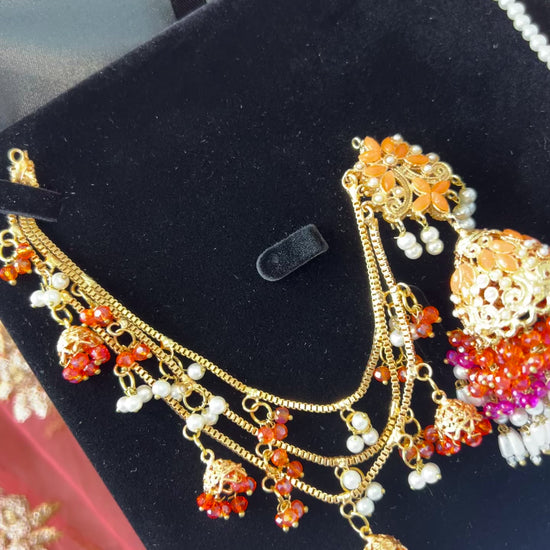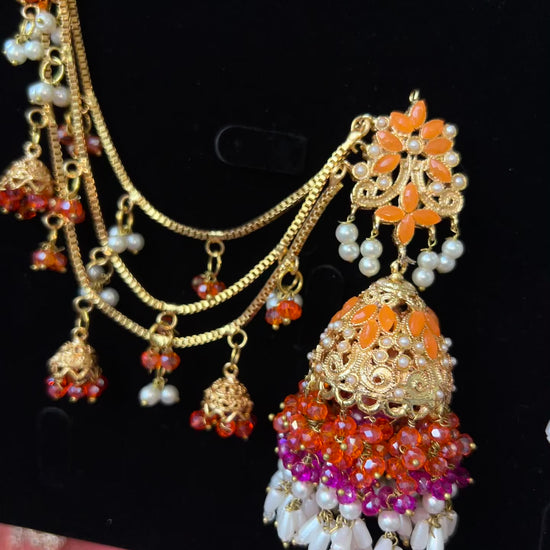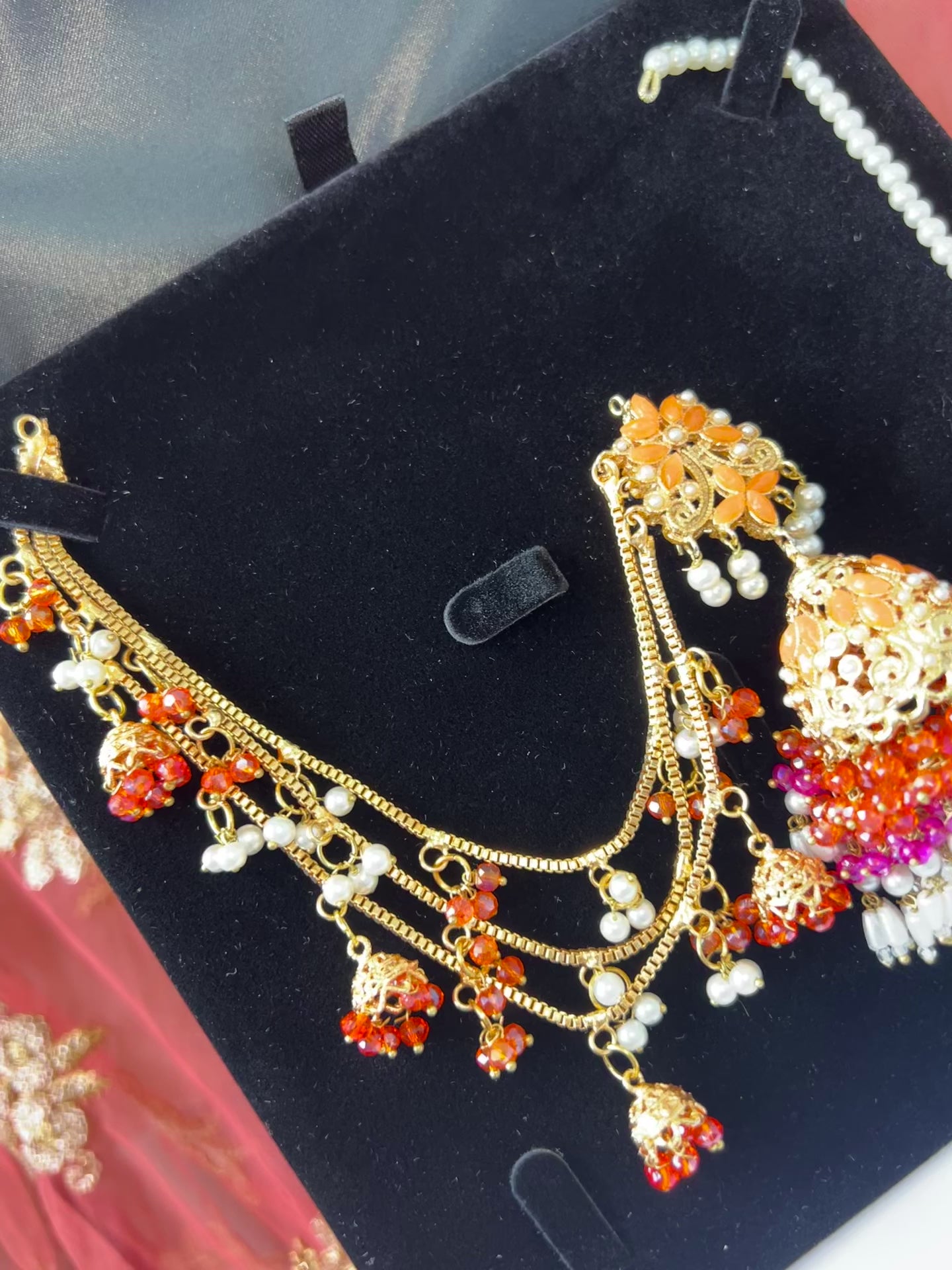 Comes with Jhumkas and tikkas. Jhumkas have attached saharey. Delicately detailed in colours shown. Saharey have THREE layers. COLOURS MAY VARY SLIGHTLY DEPENDING ON STOCK