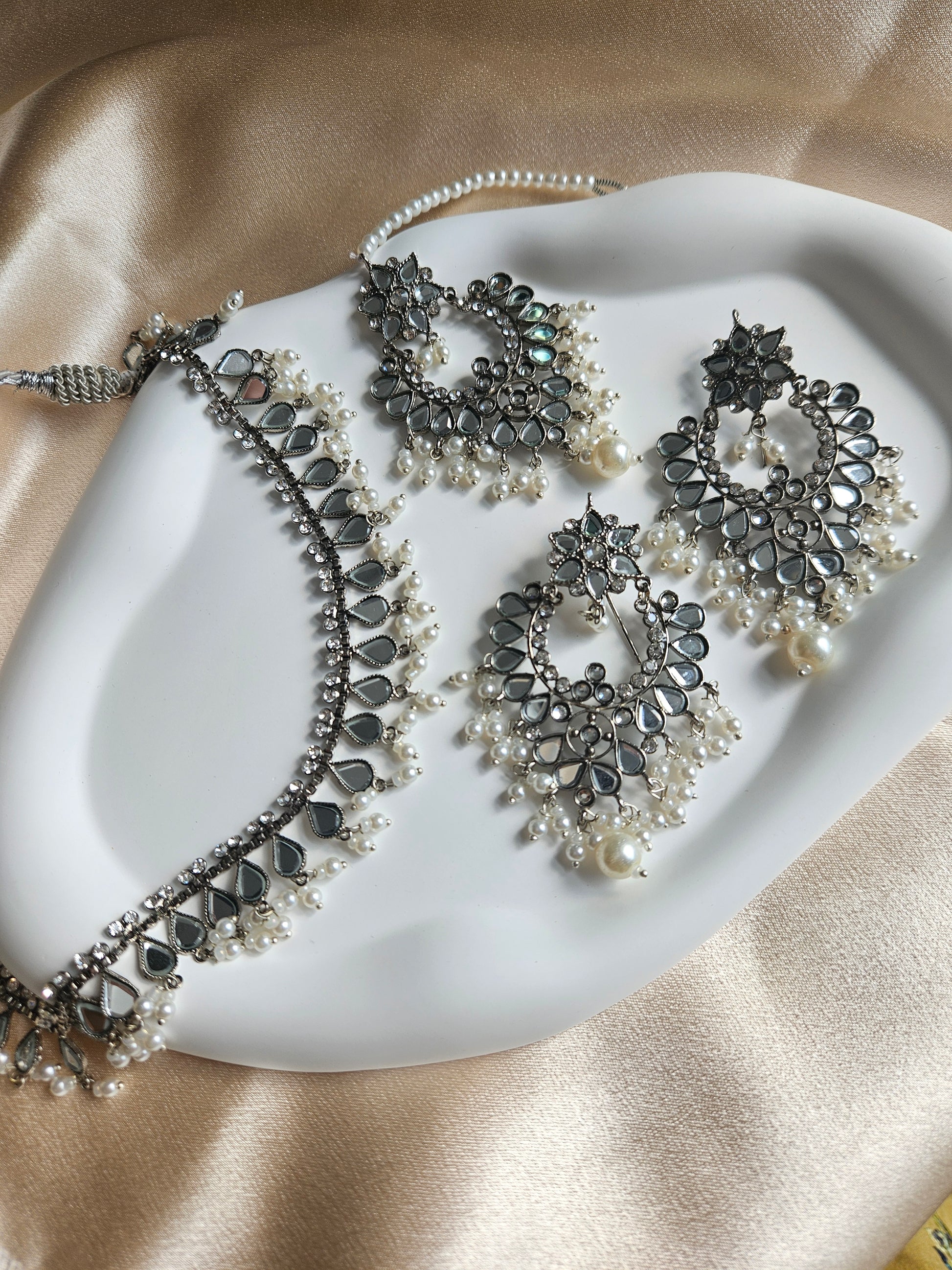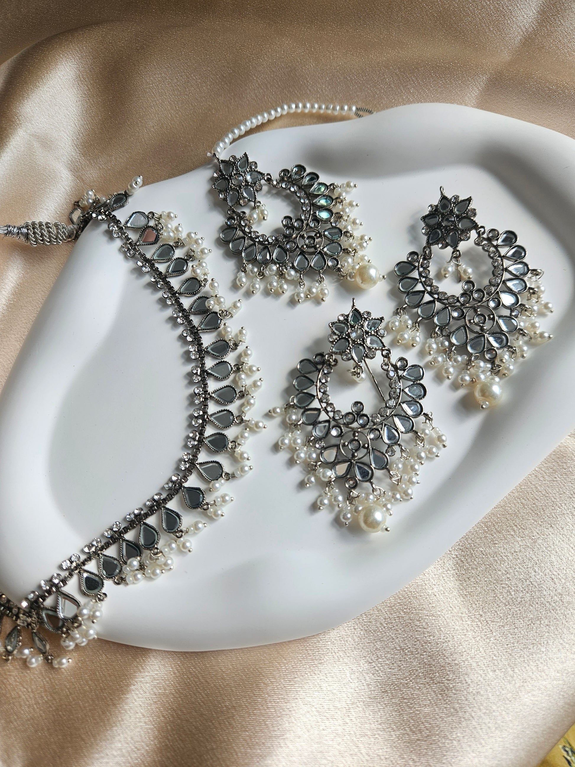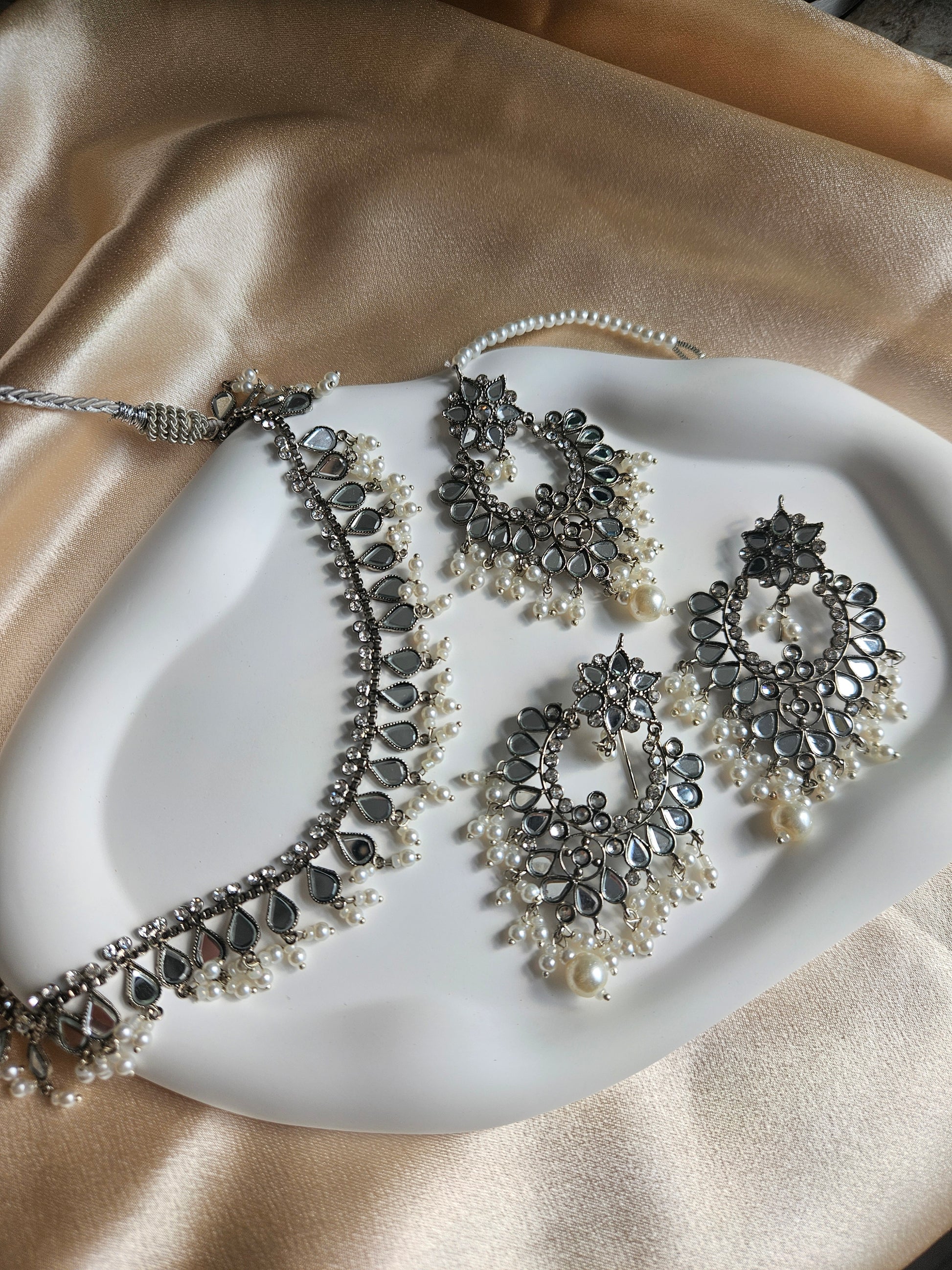 Lightweight silver earrings, choker and tikka set with faux pearl and diamonté detailing adorned. Material used is stainless steel!
