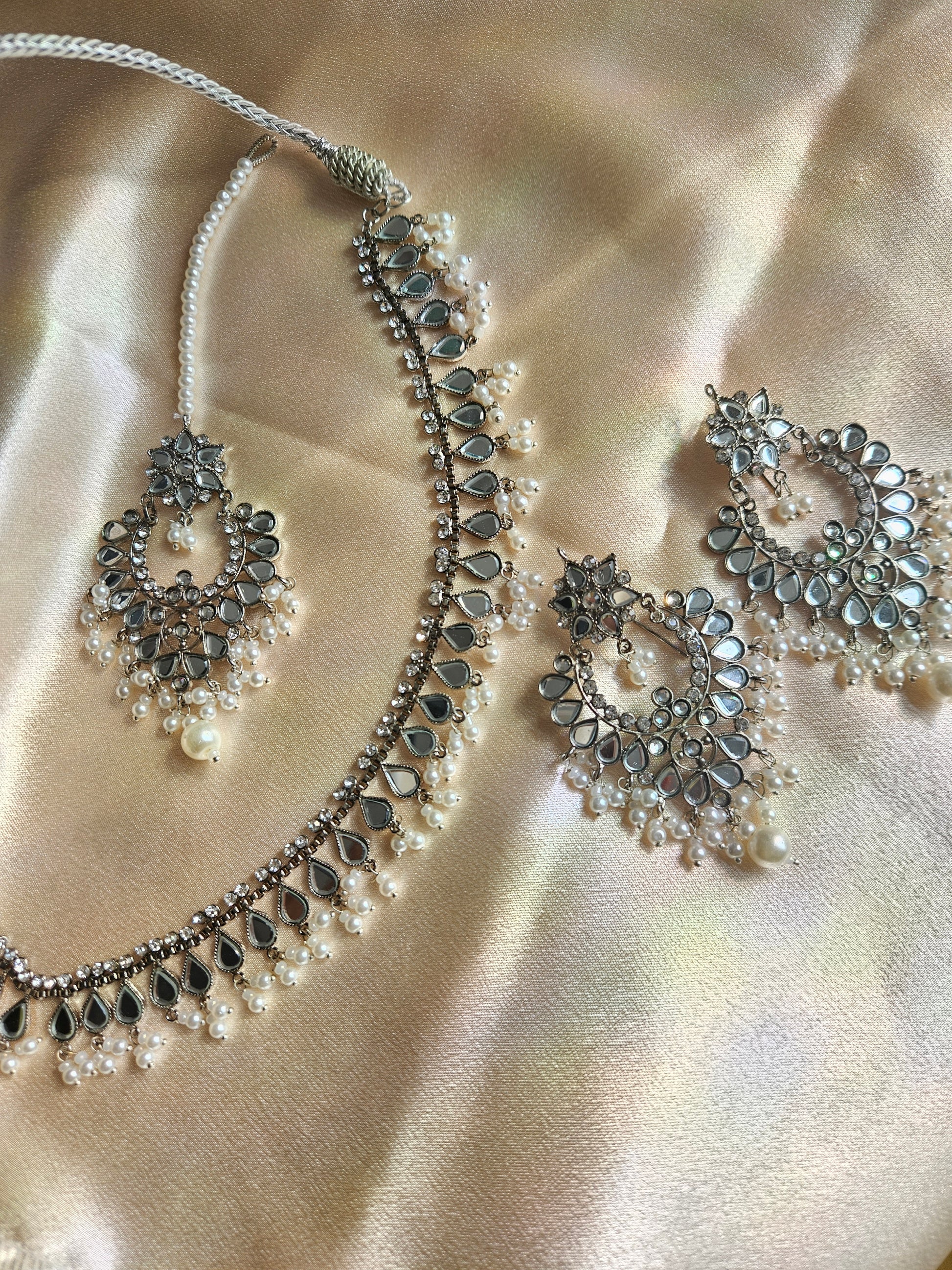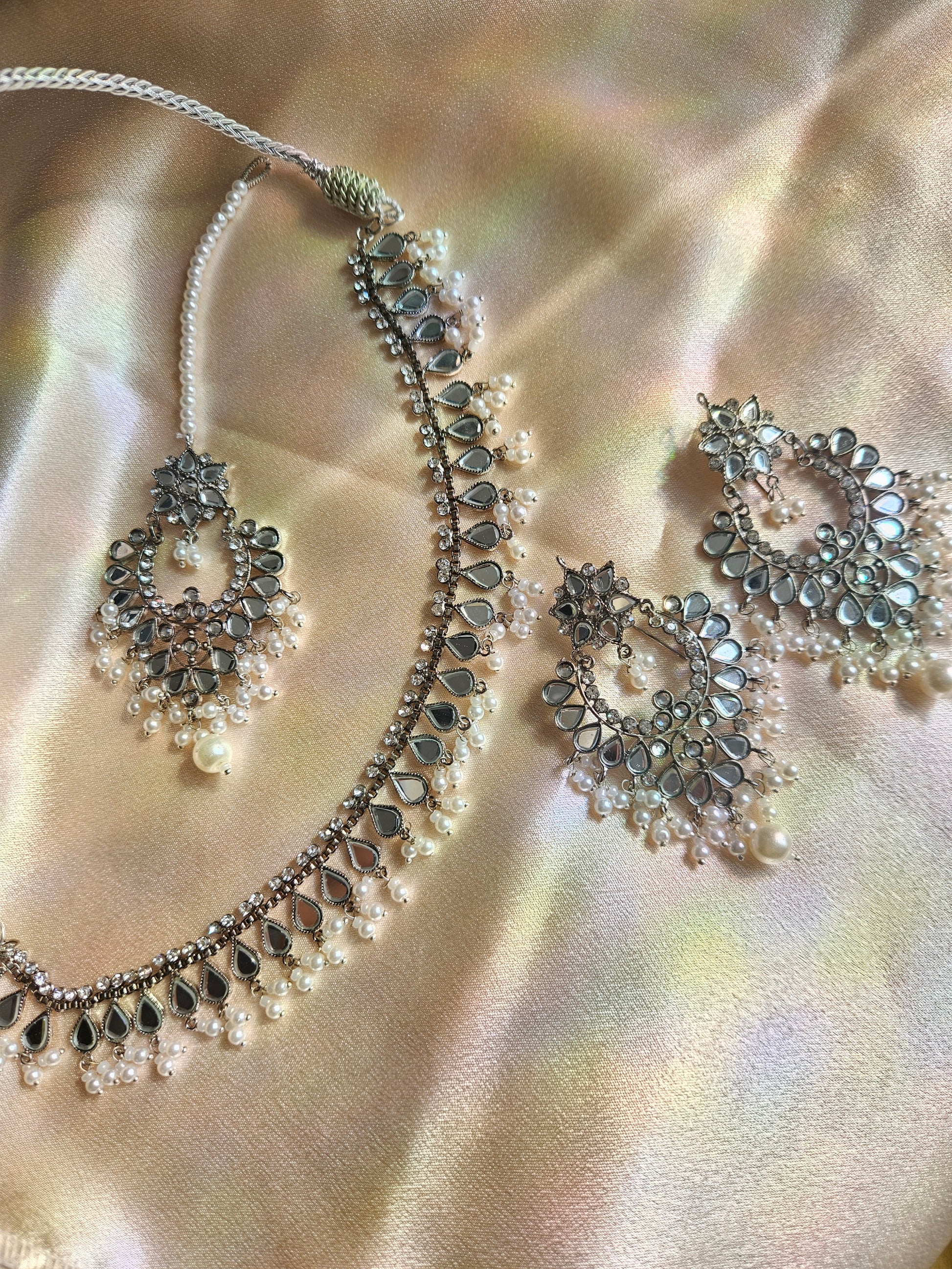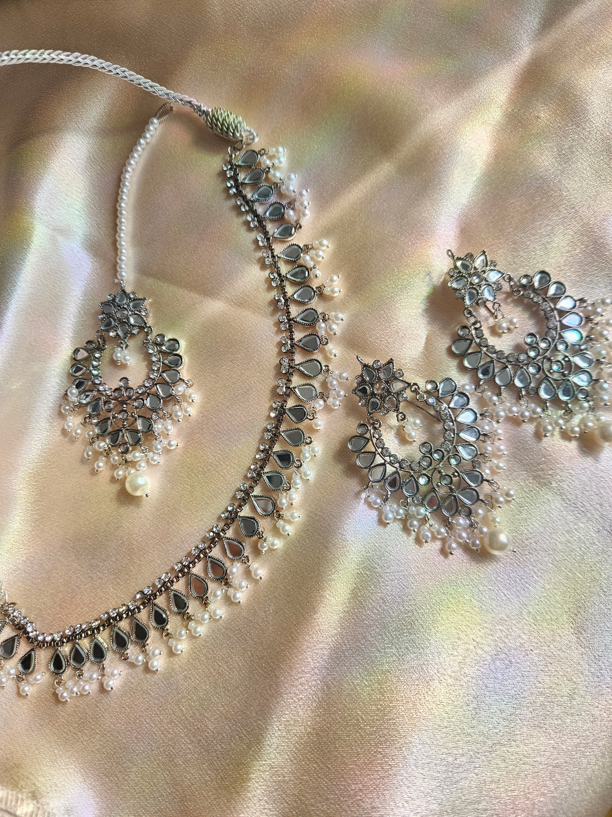 Lightweight silver earrings, choker and tikka set with faux pearl and diamonté detailing adorned. Material used is stainless steel!